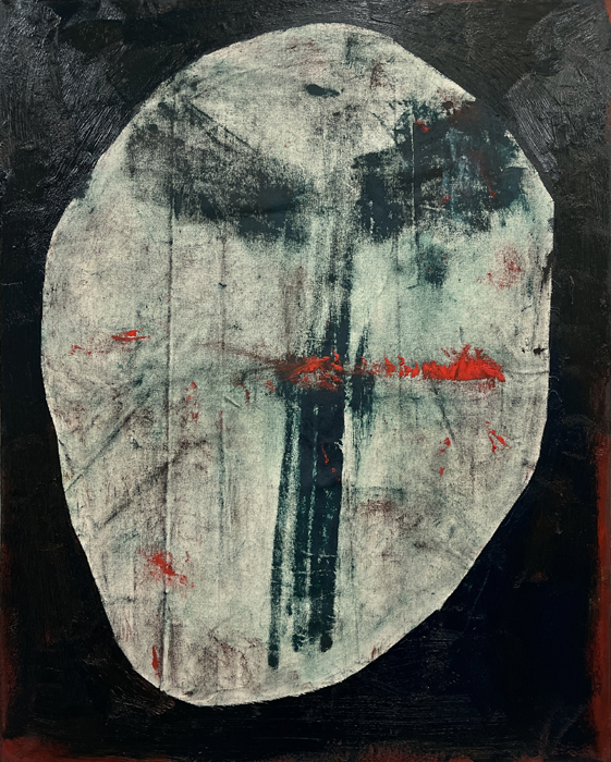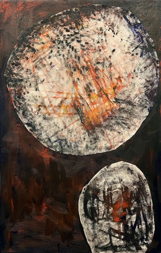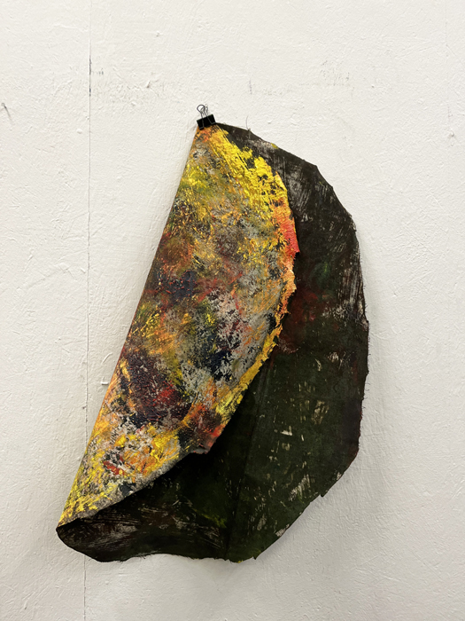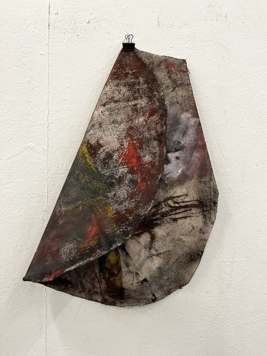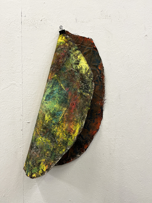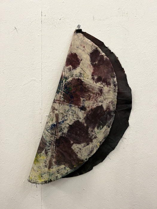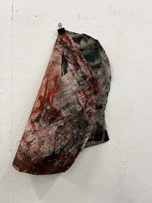 Pour développer ce corpus de travaux, j’ai procédé à une méthodologie qui consiste à appliquer des fragments de toile vierge sur des peintures fraîchement peintes, de les décoller pour les réappliquer sur une autre toile afin de transposer l’impression d’une peinture sur l’autre. Ce processus de travail a été réalisé pendant plusieurs mois en répétant l’opération afin d’imprégner les plètses de différentes strates de peintures successives. L’intention de répétition explicitement désiré tend à une volonté de dépassement de soi. »